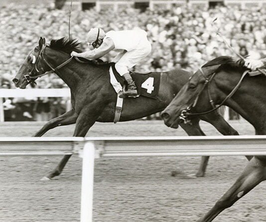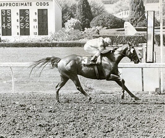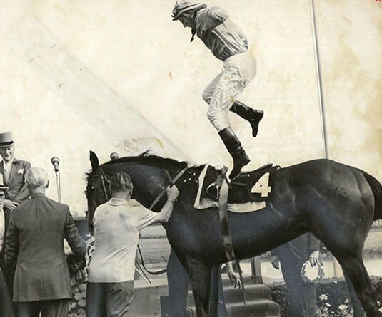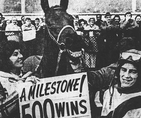 Sandy Hawley and his wife, Sherrie, hold a sign at Laurel proclaiming realization of the goal Hawley set for himself last New Year’s Eve, to ride 500 winners in 1973. Charlie, Jr., the horse in the picture above was No. 500 for Canadian jockey. He kept on going and completed Saturday’s card with four wins and total of 503.×